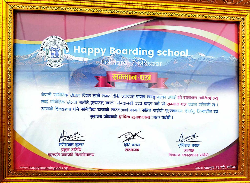 कास्की । गायक तथा संगीतकार रामभक्त जोजिजूलाई सम्मान गरिएको छ । शनिबार ह्याप्पी बोर्डिङ स्कूल मासबार पोखराले आयोजना गरेको अभिभावक दिवस तथा पुरस्कार वितरण कार्यक्रममा जोजिजूलाई सम्मान गरिएको हो ।