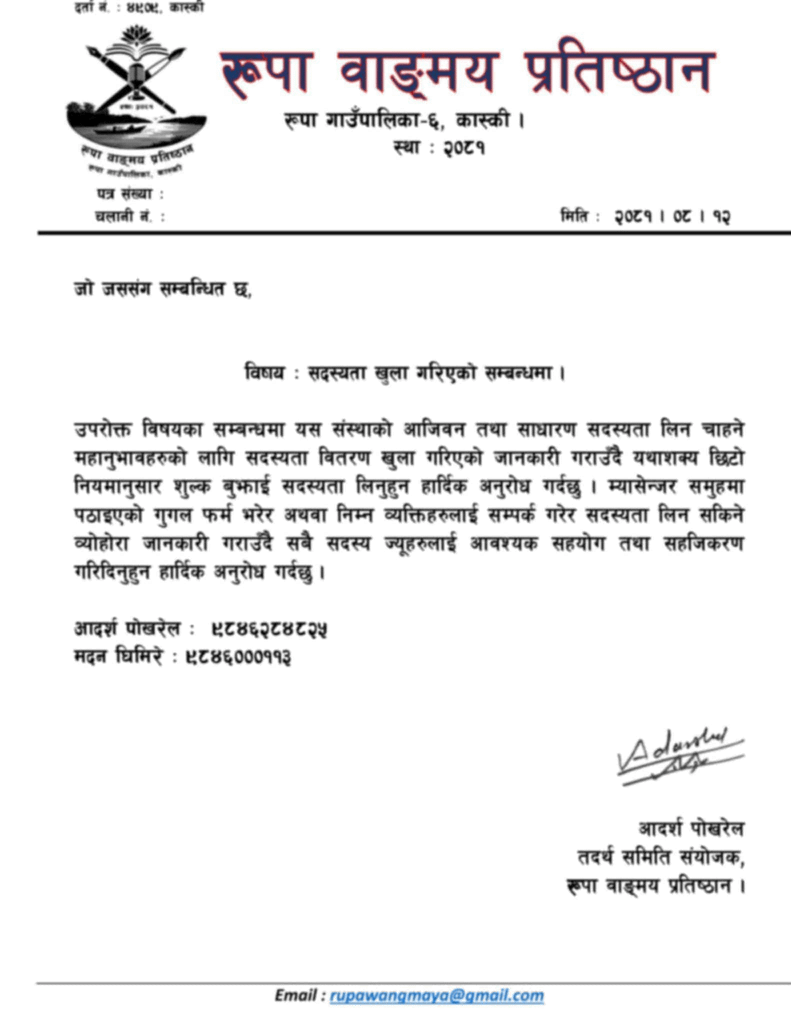 सदस्यताका लागि आदर्श पोखरेल(९८४६२८४८२५) र मदन घिमिरे(९८४६०००११३) मा सम्पर्क गर्न अनुरोध गरिएको छ ।